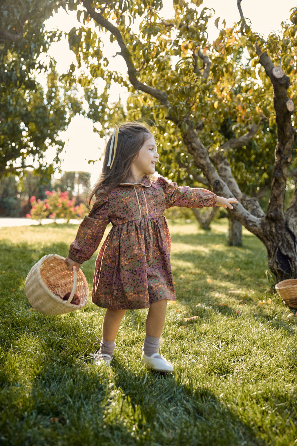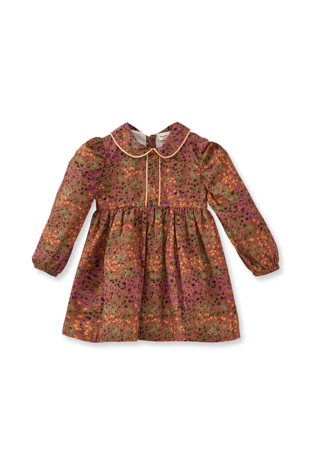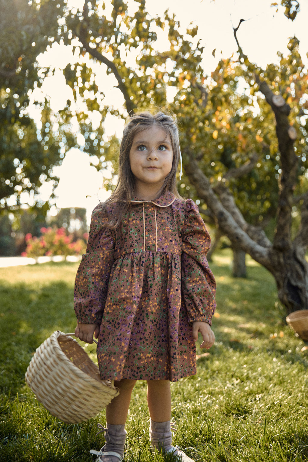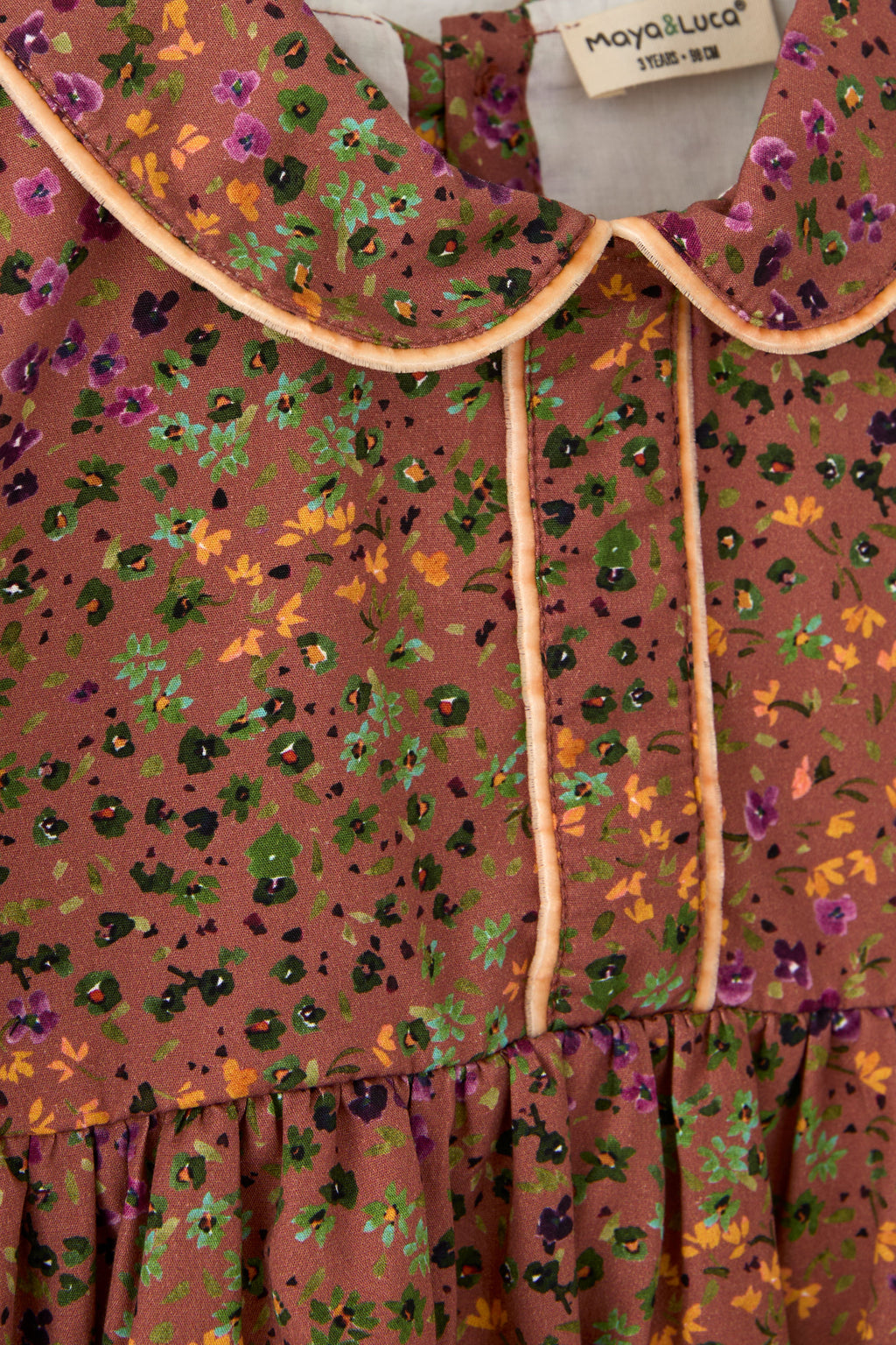 Kız Bebek Çiçek Desenli Kadife Biyeli Kahverengi Pamuk Elbise - Riki Baby&Kids